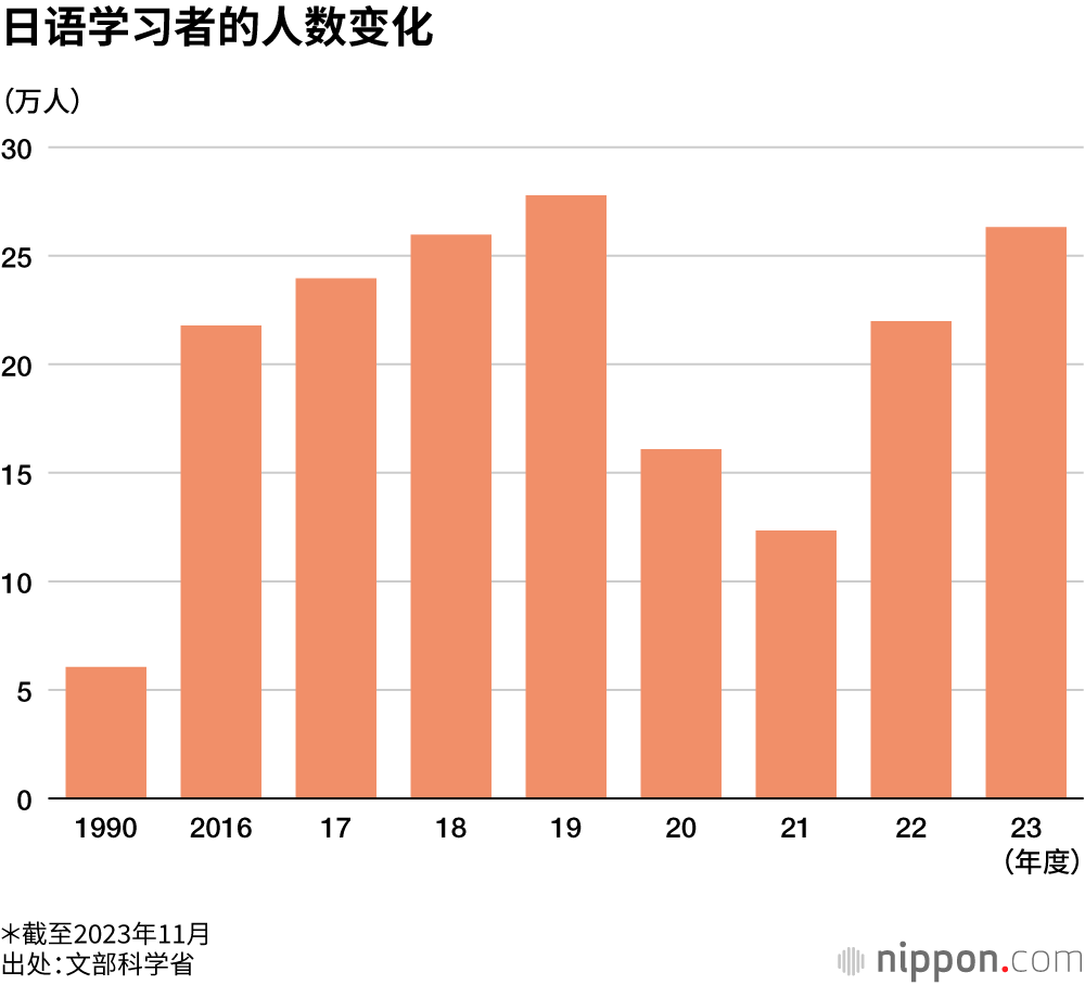 为防控新冠疫情的入境限制措施放宽之后,日语学习者开始转为增加。2023年达到263170人,已恢复至疫情前的水平。