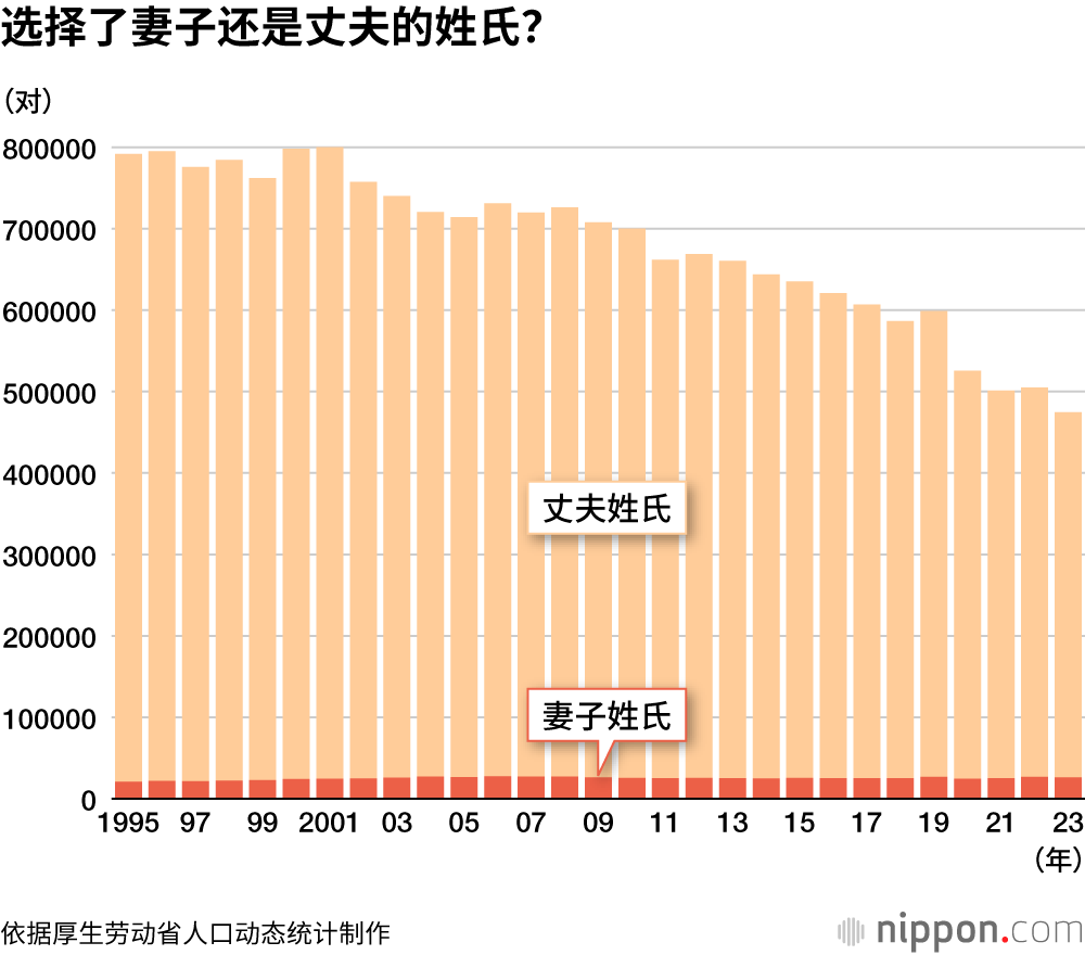 尽管条文中写的是“称呼丈夫或妻子的姓氏”,但厚生劳动省的人口动态统计调查显示,2023年结婚的474741对夫妇中,选择妻子姓氏的共有26344对,仅占整体的5.5%。对于多数女性来说,“结婚即改姓”已经成为一个无法回避的问题。