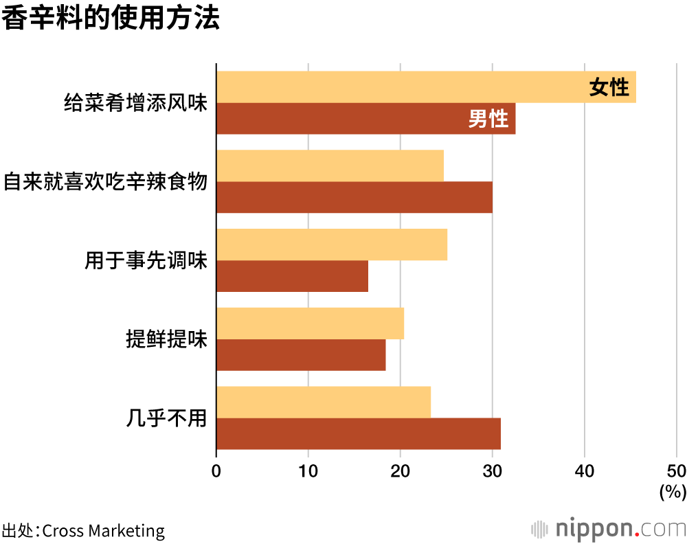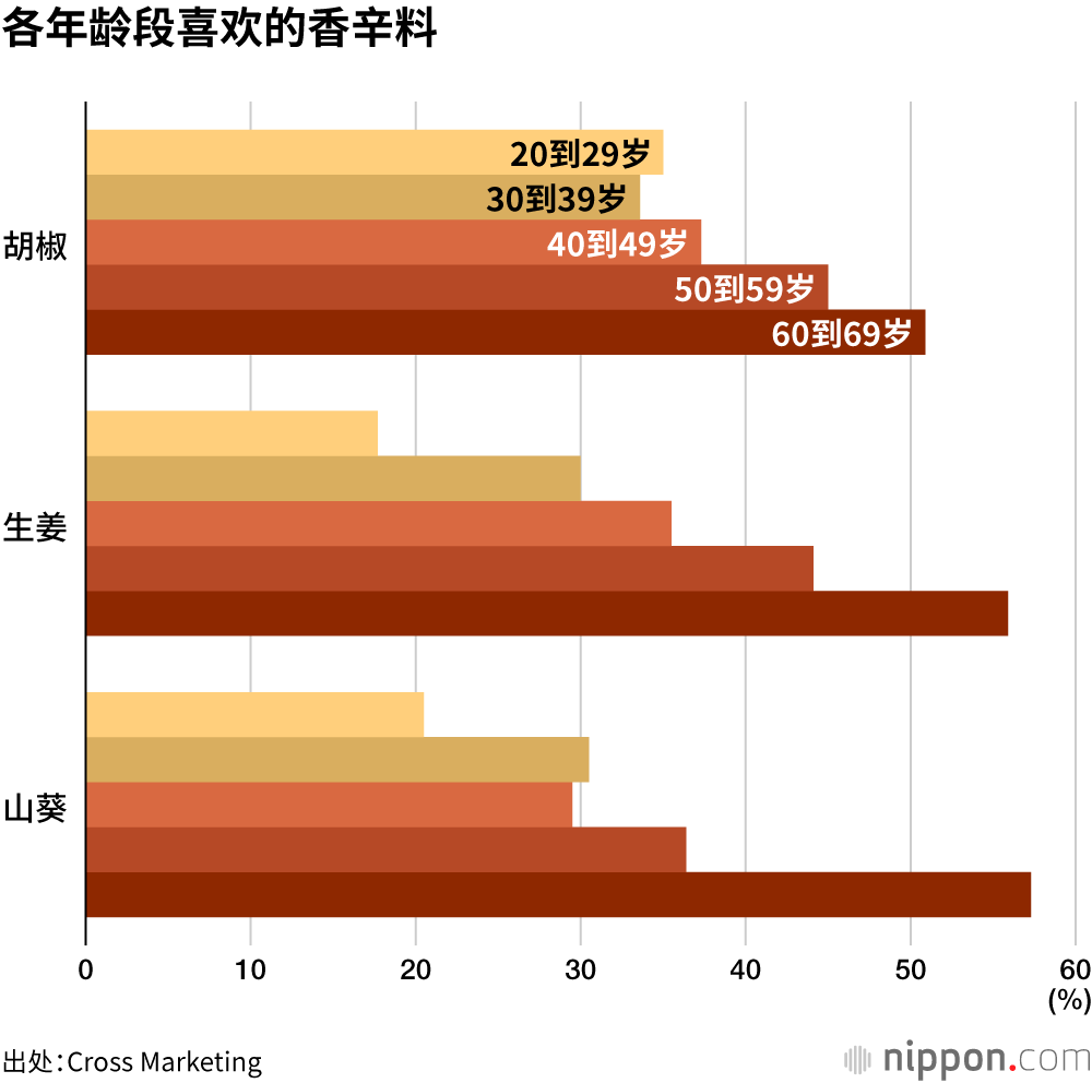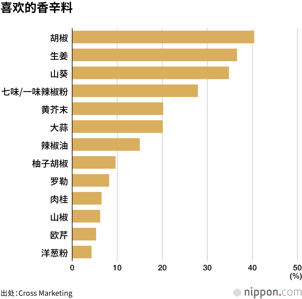 开展调查业务的Cross Marketing公司(东京都新宿区)针对全国1100名20到69岁民众询问他们喜欢的香辛料情况,结果显示选择“胡椒”的受访者最多,占比达40.4%。