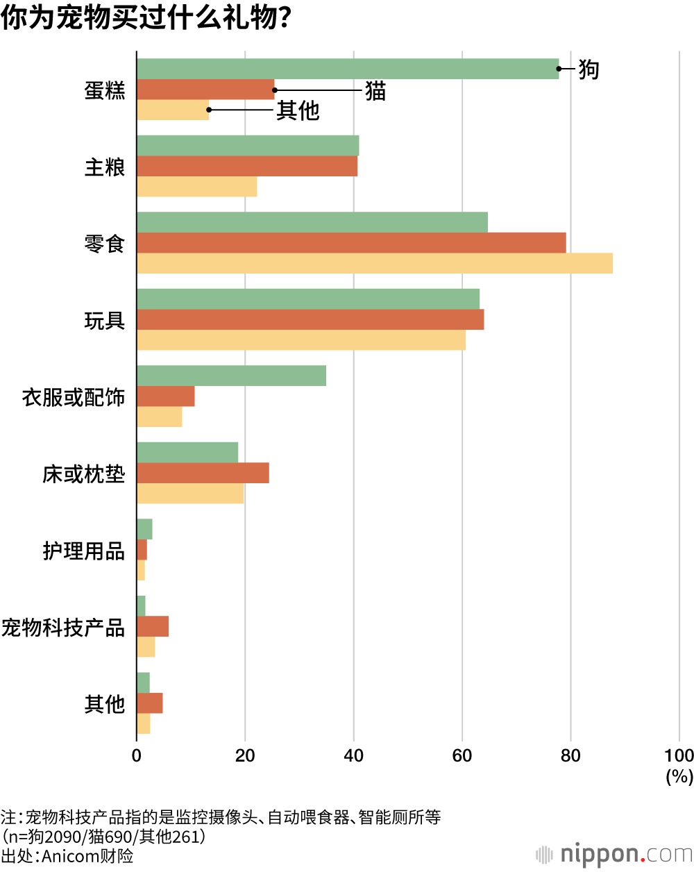 礼物主要是“零食”和“玩具”。养狗的家庭中,购买“生日蛋糕”的情况也比较多。经营宠物用品的电商网站等都推出了动物也可以放心食用的蛋糕,主要是用水果、蔬菜、肉类等食物泥制成。