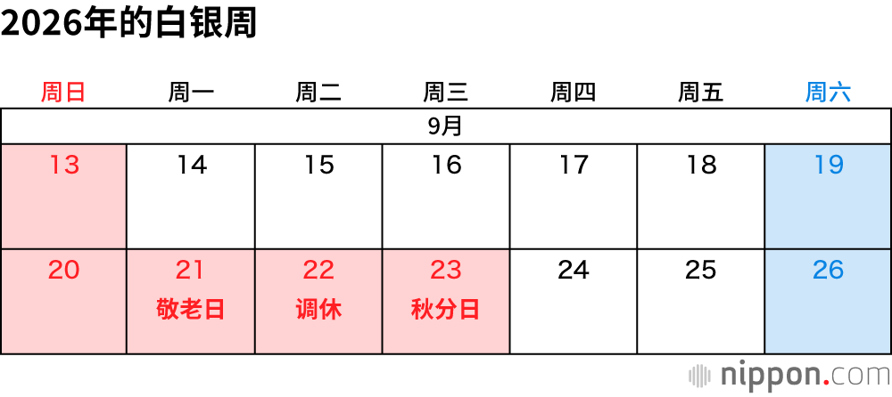 “敬老日”固定在9月第3个周一,确保了快乐星期一的三连休。23日“秋分日”是周三。《节日法》规定“两个节日之间的工作日调整为休息日”,所以22日周二也休息。换句话说,算上周末就是一个可以休息到周三的中长假。这是自2015年以来,也就是时隔11年之后再次在9月适用此项规定。