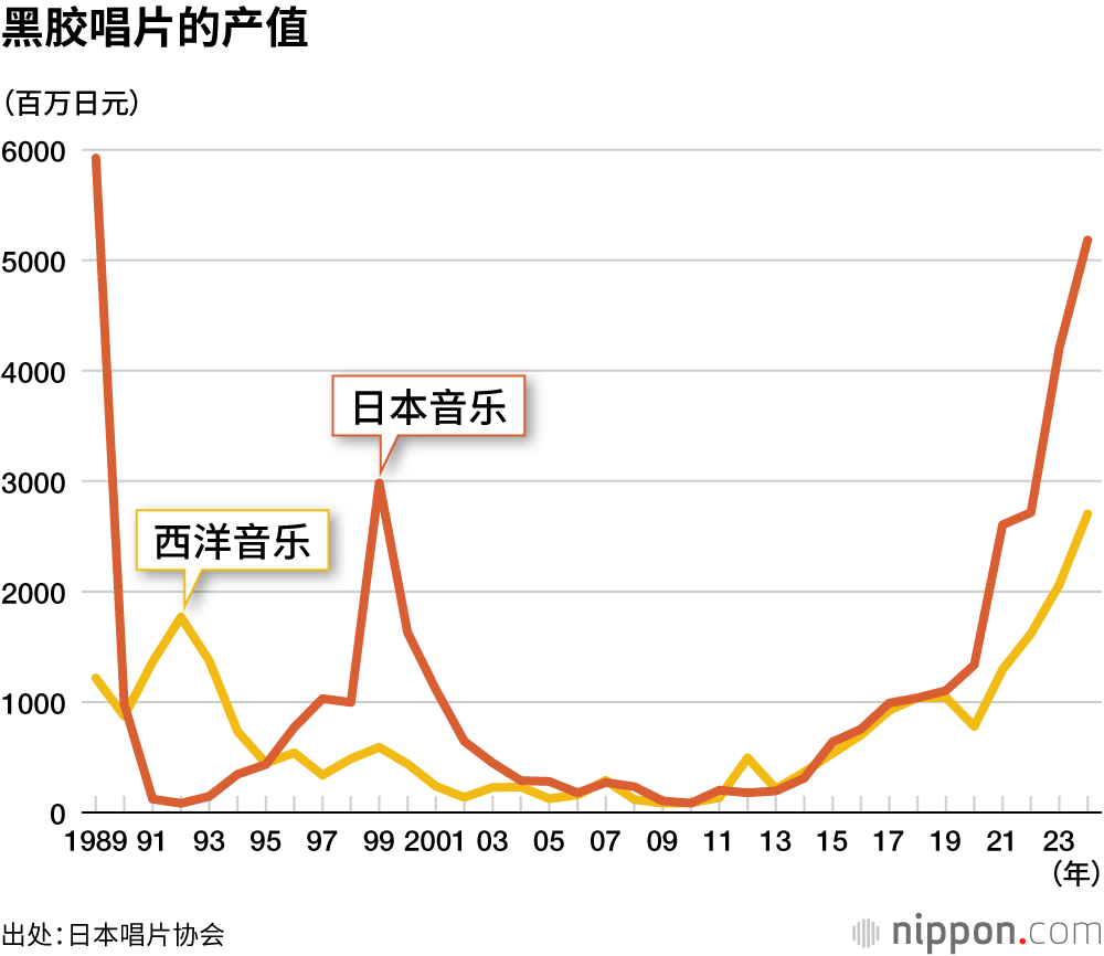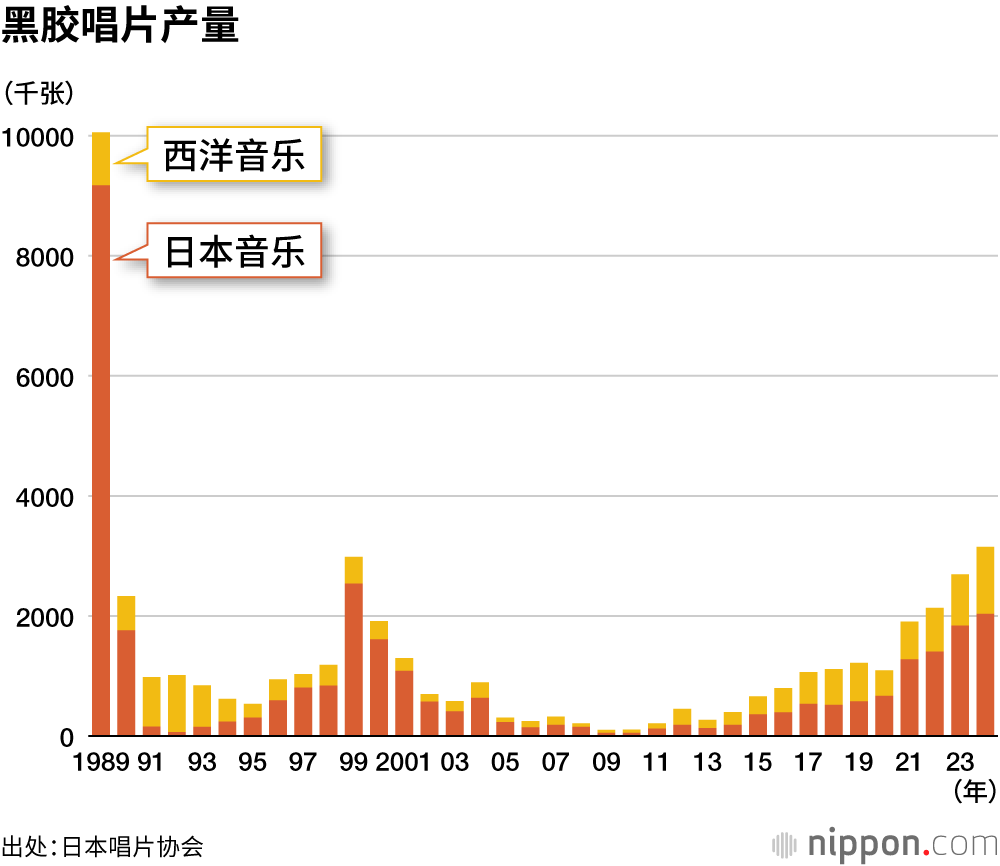 日本唱片协会2025年1月发布的数据显示,2024年日本音乐和西洋音乐黑胶唱片合计产量同比增加17%至3149000张,产值同比增加26%至78.87亿日元。自1989年以后,即35年来首次超过70亿日元。