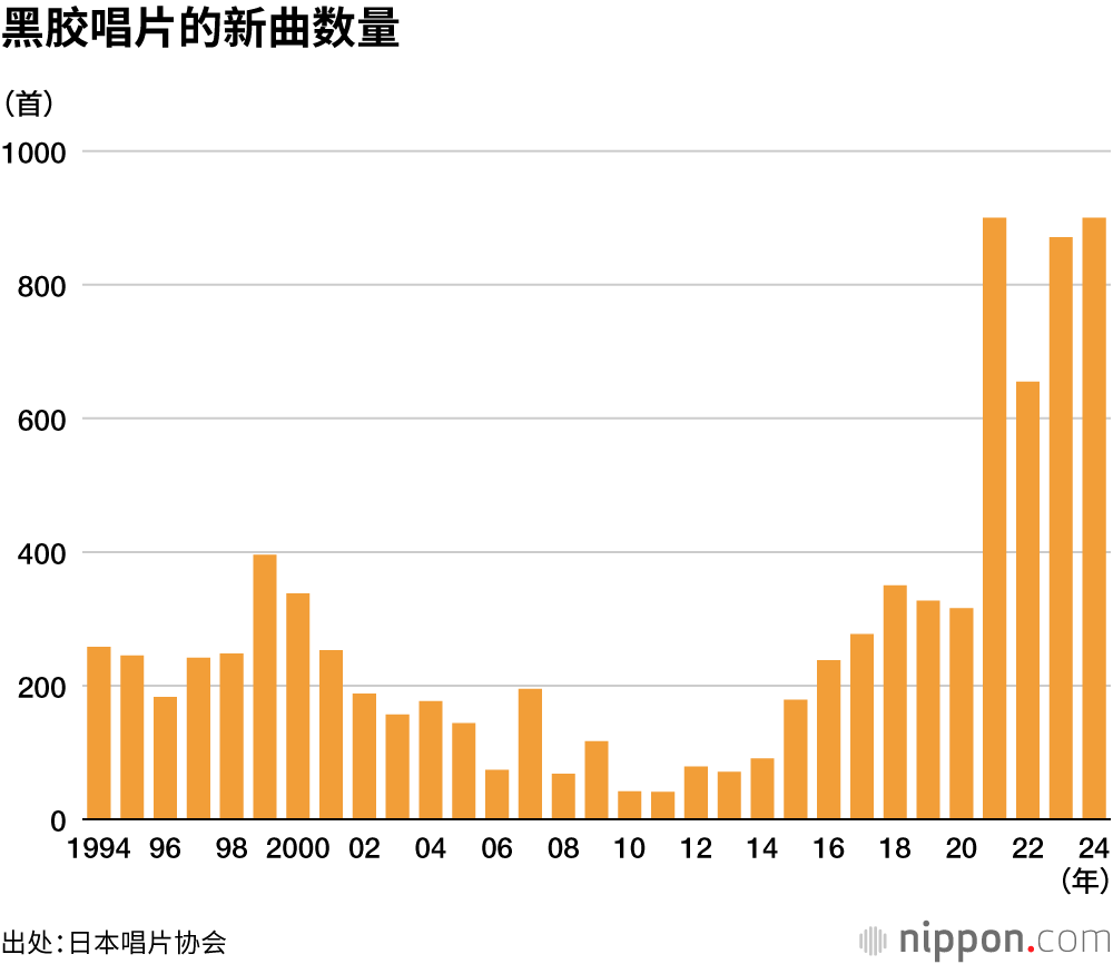 黑胶唱片的新曲数量也在不断增多。2024年共有900首新曲,已经达到2011年(41首)的22倍。
