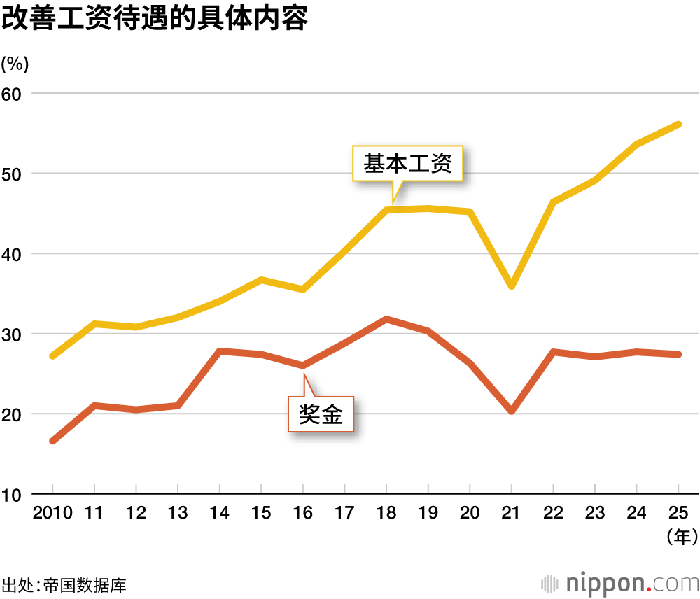 帝国数据库公司实施的调查显示,2025年度预计为正式员工改善工资待遇(上调基本工资、奖金、一次性补贴)的企业比例为61.9%,连续四年同比提高,自开始实施此项调查以来首次超过60%。而表示没有涨薪计划的企业比例仅为13.3%,创历史最低水平。