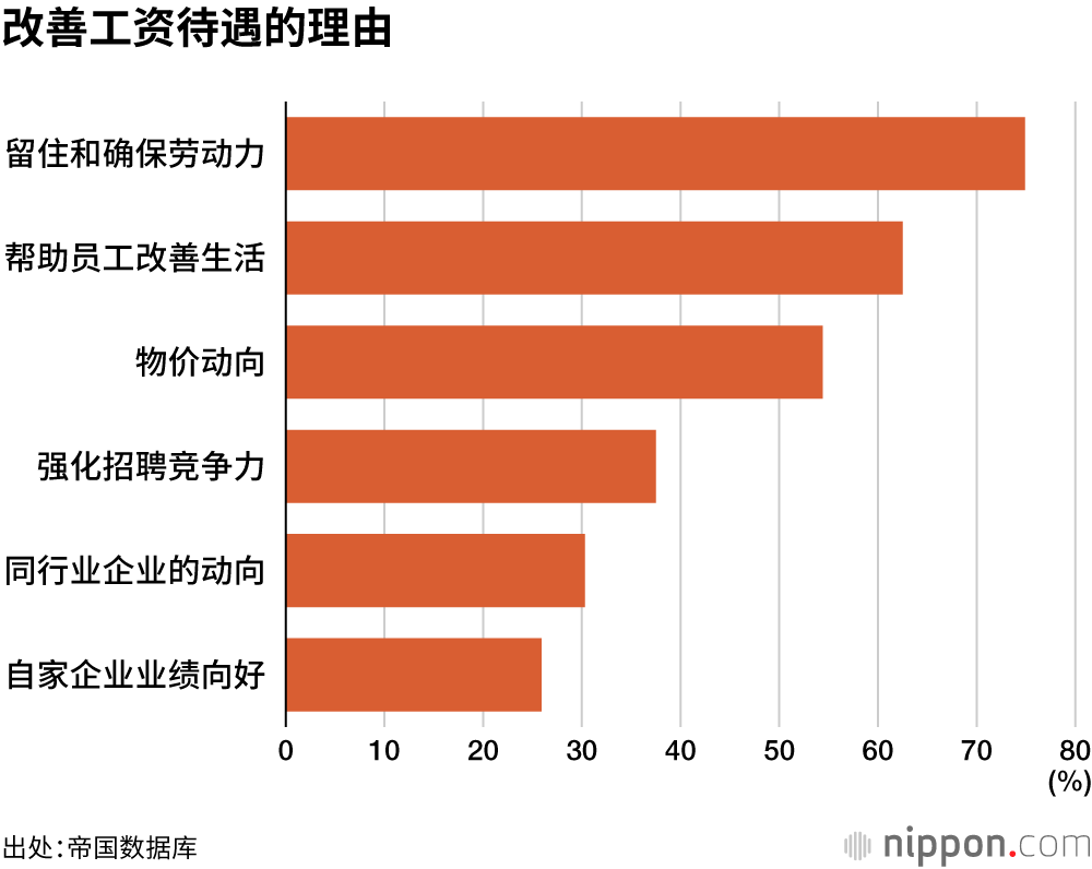 关于改善工资待遇的理由,选择出于人手短缺等因素希望“留住和确保劳动力”的企业最多,占比达74.9%。其次是“帮助员工改善生活”(62.5%)。近年饮料食品等生活必需品大幅涨价,有54.4%的企业列举了“物价动向”,同比增加2.8个百分点,连续三年超过了半数。