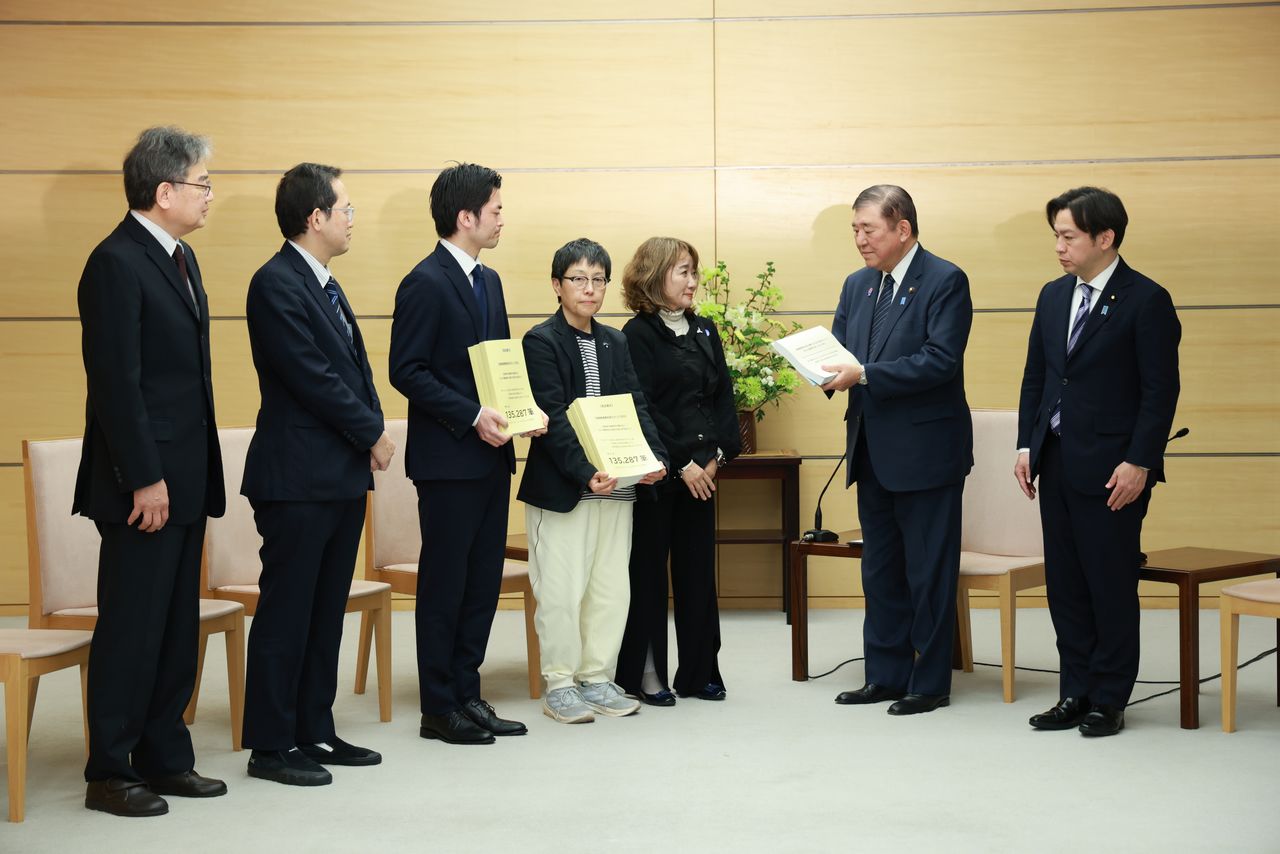石破茂等政府官员接受全国癌症患者团体联合会递交的“高额疗养费制度”相关问卷调查报告(图片:时事社)