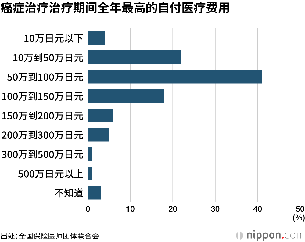 全国保险医师团体联合会的调查(1月30日至2月16日实施,收到284份回答)显示,确诊癌症后,为接受治疗而不得不离职,“年收入减少”的受访者比例达到了52.1%。关于治疗期间全年最高的自付医疗费用,回答“50万到100万日元”的受访者最多,占比为41%。