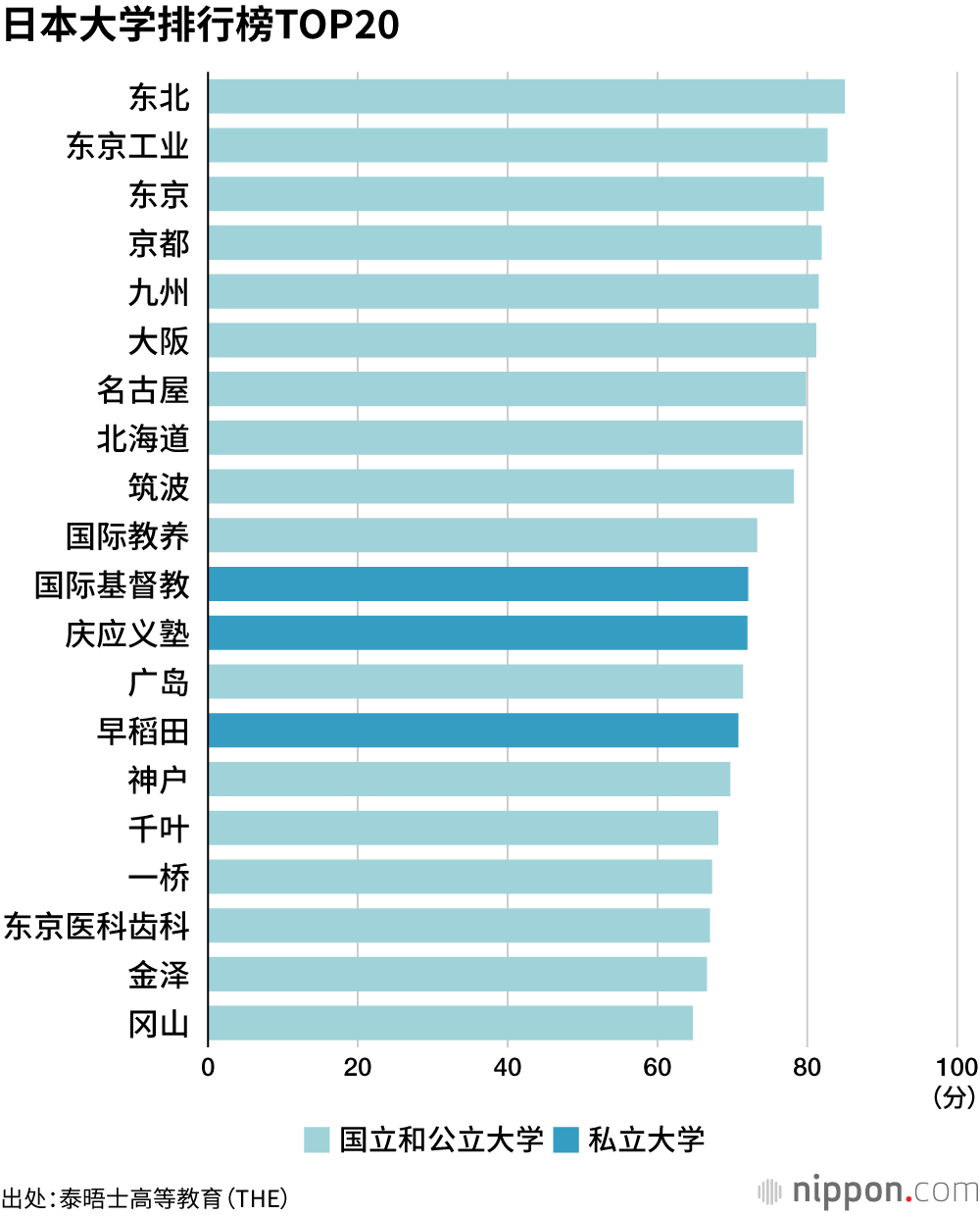 在英国教育专业杂志《泰晤士高等教育》发布的《世界大学排行榜日本版2025》中,东北大学连续五次夺得综合排名第一名。东京工业大学(现在的东京科学大学)位居第二,东京大学排名下滑一位至第三位。7所旧帝国大学均进入前八名,在学术界依然拥有举足轻重的地位。国际教养大学排名上升五位跻身前十。前20名中仅有三所私立大学。