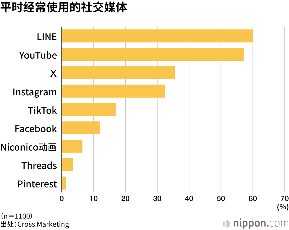 无论老幼,无论坐在电车里还是咖啡店、小餐馆里,几乎人人都盯着手机屏幕并露出各式各样的表情。市场营销调查企业Cross Marketing(东京都新宿区)2025年4月针对全国1100名20到69岁民众实施的《社交媒体相关调查》显示,在经常使用的社交媒体中,“连我(LINE)”(60.1%)和“油管(YouTube)”(57.2%)的使用率遥遥领先。