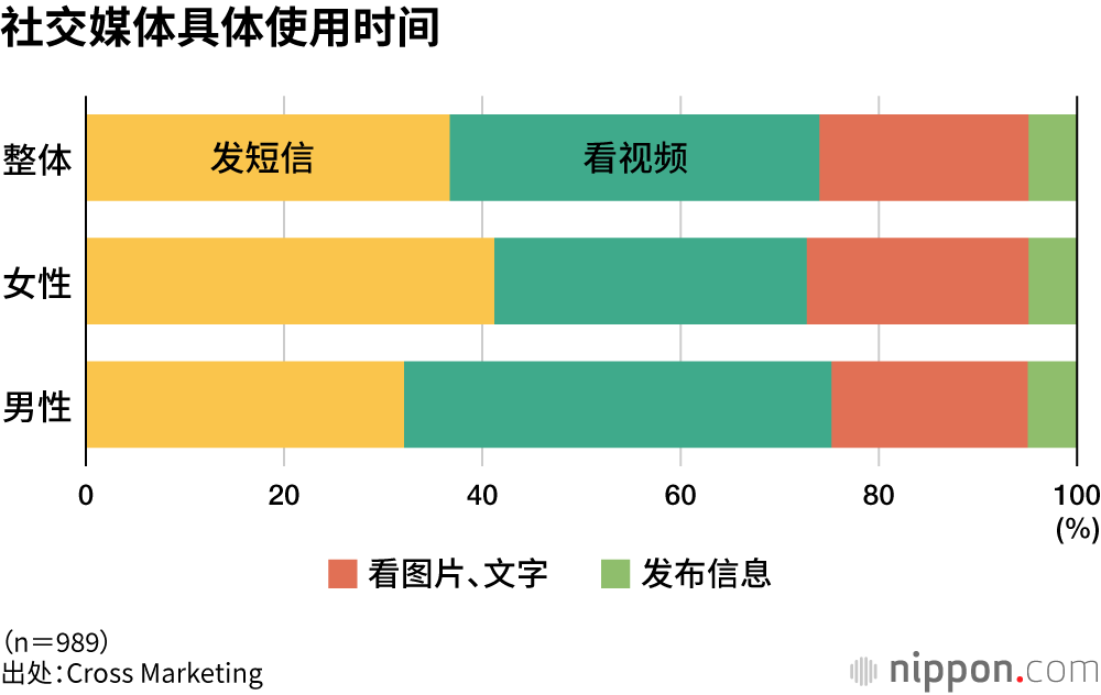 只有4.9%的受访者在“主动发布信息”方面用时最多,且几乎不存在性别差异。近段时间,通过社交媒体进行毁谤中伤或散布虚假信息所造成的危害已经成为一个重大社会问题,但从这份调查结果可以看出极少数人发布的“有问题内容”在扩散后引发严重事态的状况。