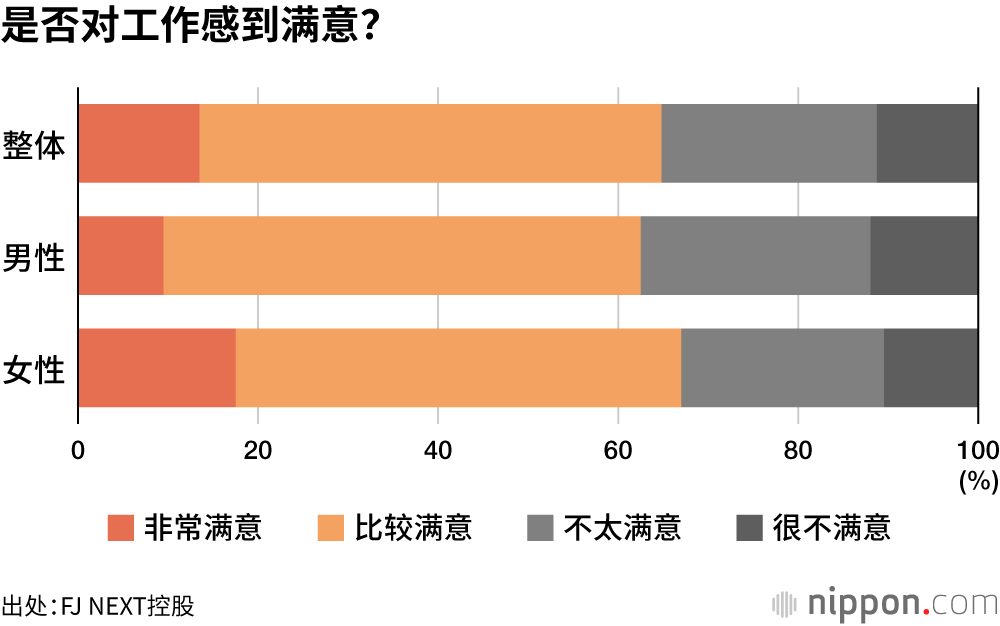 对于需求日益增长的辞职代理服务,6.8%的受访者表示“愿意积极使用”,21.8%表示“相对来说愿意使用”,两者合计大约30%的人对此持积极态度。同时,整体上超过60%的受访者表示对现在的工作“感到满意”,并且女性受访者的这一比例(67%)高于男性(62.5%)。