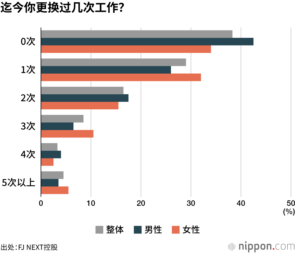 从男女整体来看,关于更换工作的目的(多选,最多选三个),选择“涨薪”的受访者最多,占比达64.5%,其次是“提升技能”(38.3%)、“实现工作生活平衡”(27.3%)。从更换工作的次数看,38.3%的受访者选择“0次”,而至少更换过一次工作的受访者比例超过了60%,甚至有超过30%的人更换过两次以上的工作。FJ NEXT控股公司相关人士指出,这个结果表明,如今更换工作已成为一种常态。