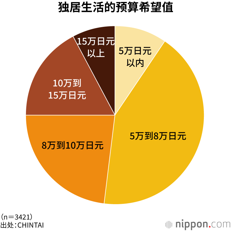 关于希望的房租区间范围,选择“5万日元到8万日元”的受访者最多,占比为42.4%,整体上大约75%的受访者希望“10万日元以内”。另一方面,只有24.8%的受访者选择了“10万日元以上”,“10万日元壁垒”似乎是独居生活的一道现实门槛。