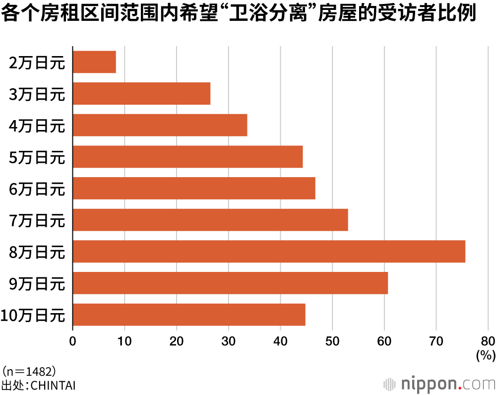 针对将“卫浴分离”设定为重要搜索条件的用户,分析他们希望的房租区间范围时可以发现,选择“6万日元”的受访者比例只有46.7%,而“8万日元”大幅增加到了75.6%。房租进一步涨到“9万日元”“10万日元”后,希望率呈现下降倾向,可以认为“卫浴分离”在高价区间被视为“理所当然”的配置,也有不少人并不会刻意将之设定为搜索条件。