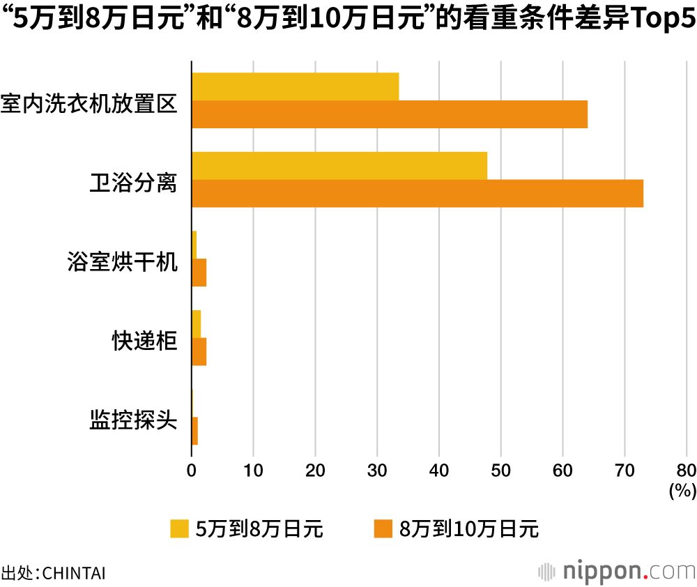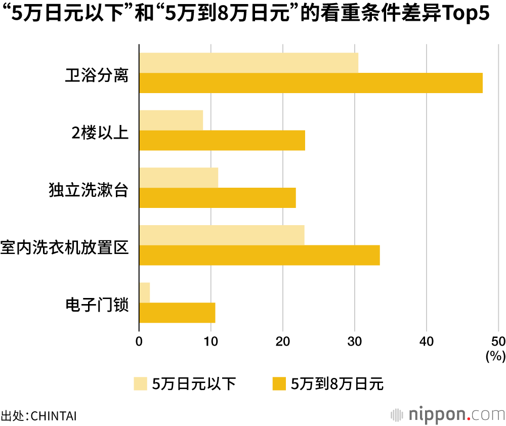 比较“5万日元以下”和“5万到8万日元”这两个价位的受访者所看重的条件时可以发现,他们在“卫浴分离”“2楼以上”等最低舒适度上的条件设定率存在较大差异。由此可以看出,租客真正开始考虑“宜居性”的第一个分水岭是5万日元。