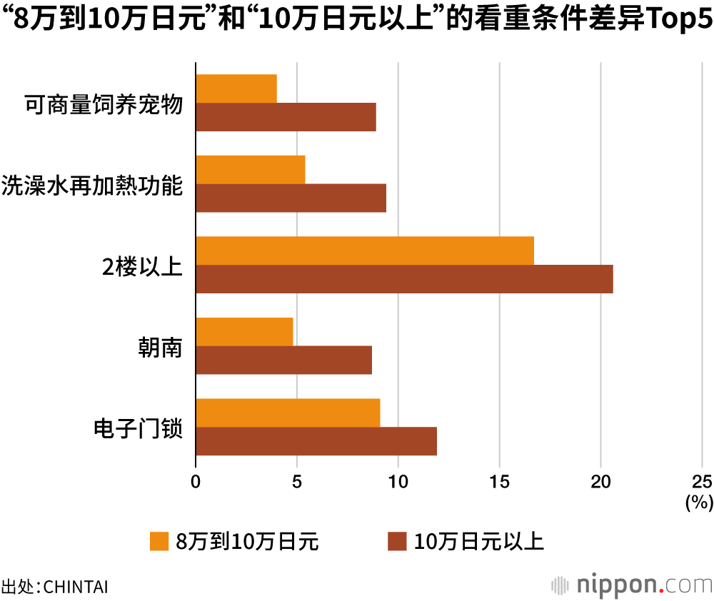 再来观察理想房租“8万到10万日元”和“10万日元以上”的受访者所看重的条件,诸如“可商量饲养宠物(可以饲养某些种类的宠物)”“洗澡水再加熱功能”“朝南”等,租客进一步追求舒适度和个性化生活方式的倾向加强,“旨在享受生活的住所选择”这种意识变得更加明确。