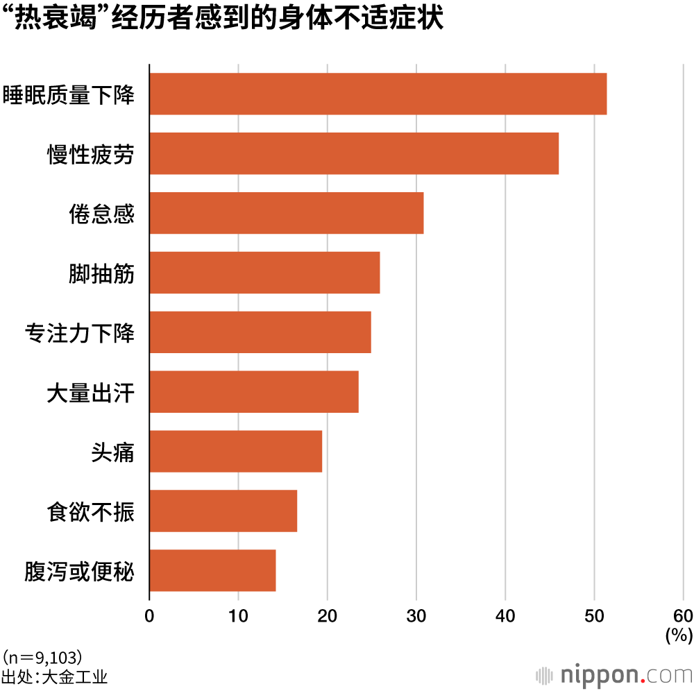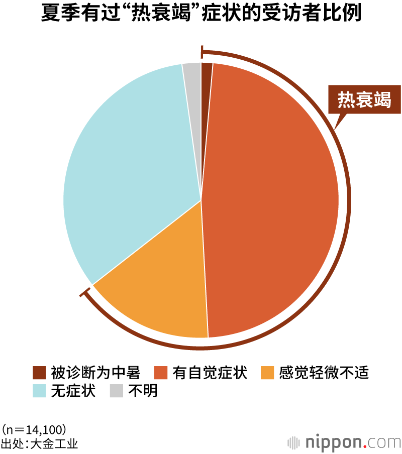 大金工业针对47个都道府县各300名20岁以上民众共计14100人实施的问卷调查显示,去年夏季在医院被诊断为中暑,或自己感觉有中暑症状,或虽然没有严重到中暑程度但出现了感觉身体不适等某些“热衰竭”症状的受访者占到了整体的64.6%。