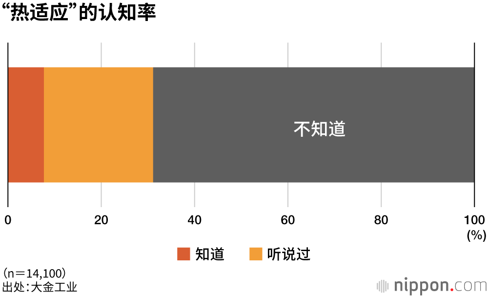 关于“热适应”,7.7%的受访者表示“知道意思”,加上“听说过”的受访者在内,只有大约30%的人知道这个说法。大金工业相关人士表示,“在夏季到来之前做好空调试运行,以及促进良好排汗的准备工作非常重要”。