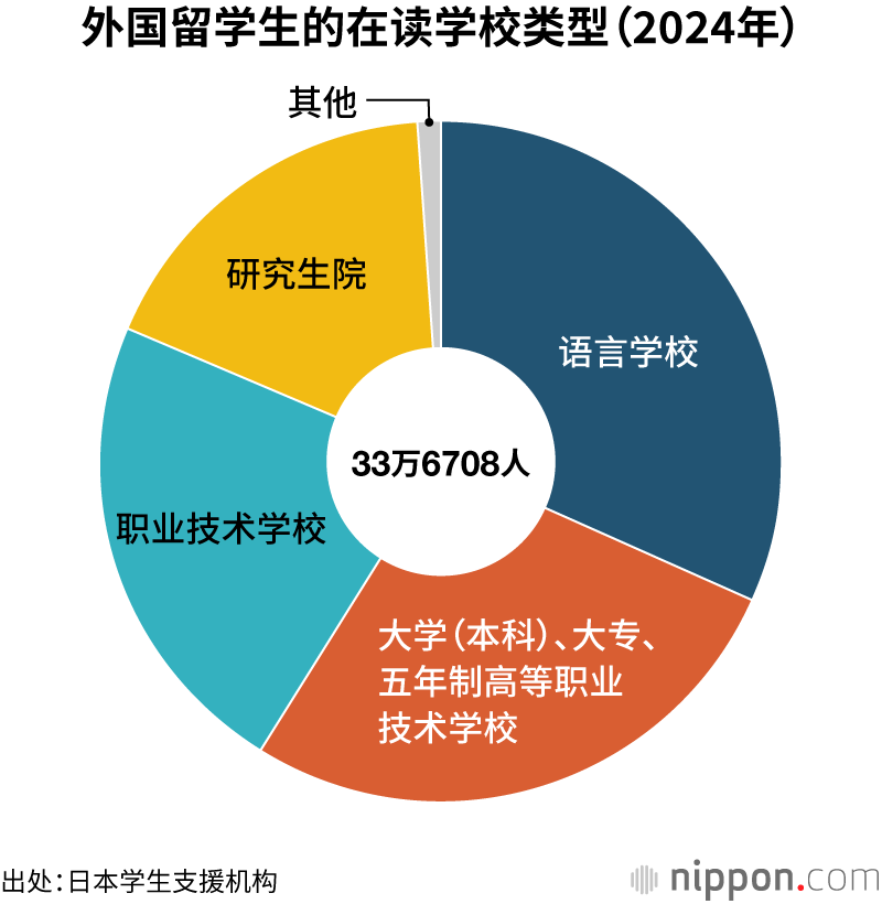 外国留学生人数从2013年起持续增加,2019年达到312000人。尽管新冠疫情期间出现锐减,但从2023年起再次转为增加。语言学校在籍留学生人数最多,共107241人,在高等教育机构学习的留学生人数合计229467人,其中大学(本科)、大专、五年制高等职业技术学校共91192人,职业技术学校76402人,研究生院58215人。