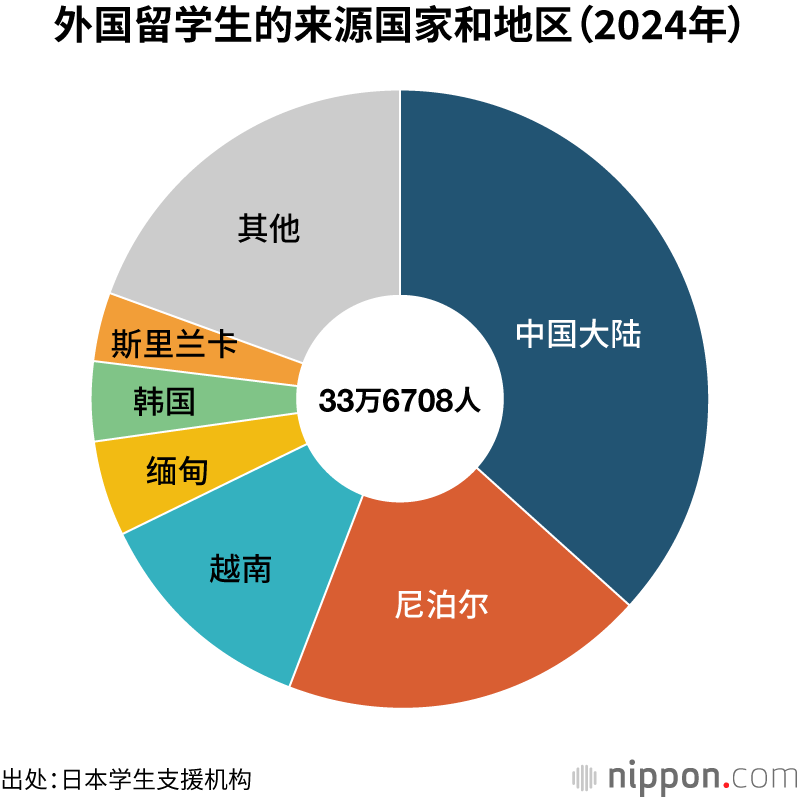 从国家和地区看,来自中国大陆的留学生最多(123485人,36.7%),其次是尼泊尔(64816人,19.2%)、越南(40323人,12.0%)、缅甸(16596人,4.9%)、韩国(14579人,4.3%)、斯里兰卡(12269人,3.6%)、中国台湾(7655人,2.3%)。来自尼泊尔的留学生一年间增加了超过26000人。
