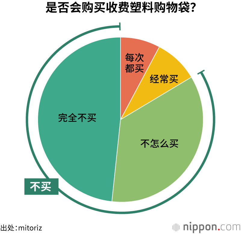 零售店铺经营支持公司mitoriz(东京都港区)以消费者购物行动数据服务会员约3000人为对象实施的调查显示,48.1%的受访者“完全不买”收费塑料购物袋,35.5%“基本不买”,合计83.6%属于“不买”派。60岁以上人群超过半数表示“完全不买”,可以看出年纪越大,“不买”派越多这一倾向。