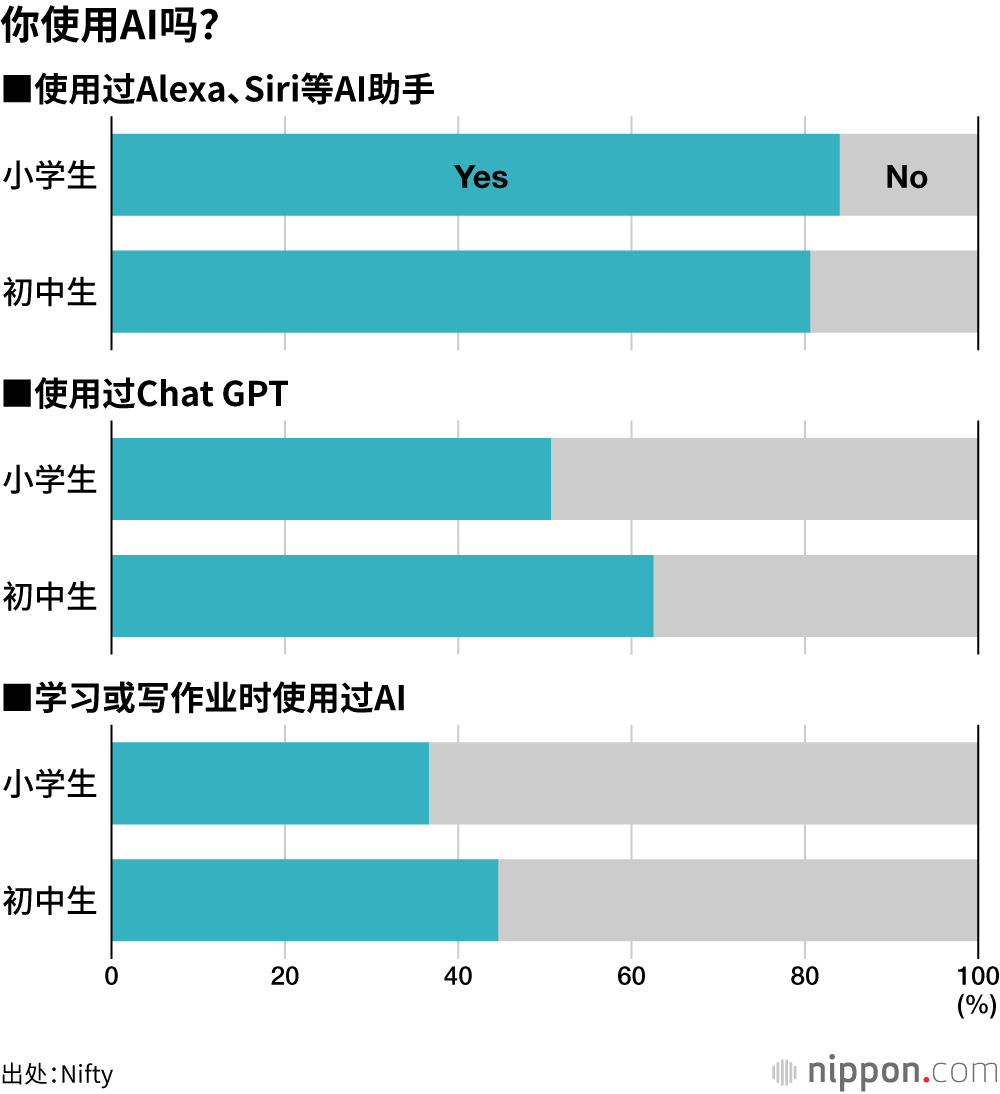 Nifty(总部位于新宿区)3月至4月期间针对少儿网站“Nifty kids”的浏览用户实施的调查(有效回答1430份)显示,84%的小学生和80.4%的初中生表示“用过”Alexa和Siri等AI助手。