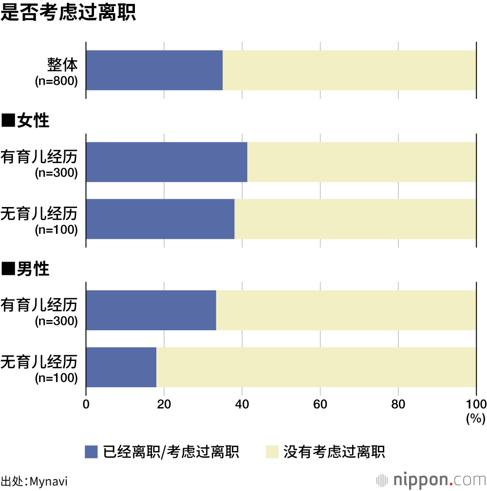 有育儿经历的女性受访者中,表示“已经离职”或“考虑过离职”的比例为41.3%,无育儿经历的女性受访者的该比例为38%。有育儿经历的男性受访者的该比例为33.3%,无育儿经历的男性受访者的该比例为18%。全部受访者整体的该比例为35%,可以看出无论男女都难以兼顾育儿和工作。