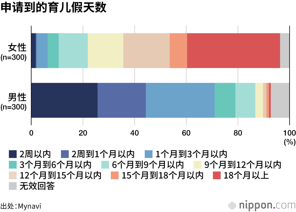 有育儿经历的人申请到的育儿假天数方面,男女之间呈现较大差距。60%的女性受访者申请到了一年以上的育儿假,而大约70%的男性受访者只有不到3个月。调查显示,尽管大约半数以上的男性受访者希望获得3个月以上的育儿假,但理想和现实之间的差距似乎难以弥合。