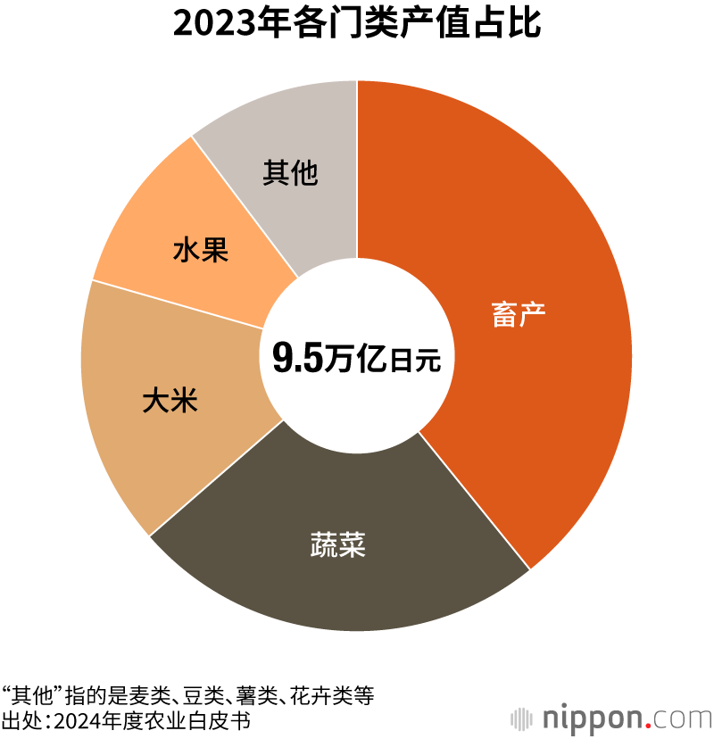 各个门类的产值如下图所示。产值最高的是畜产(3.7万亿日元,39.2%),其次是蔬菜(2.3万亿日元,24.5%)、大米(1.5万亿日元,16.05%)、水果(1.0万亿日元,10.1%)。由于2023年产大米的需求坚挺,导致民间库存量减少,交易价格上涨,进而促使大米产值同比增长了8.9%。
