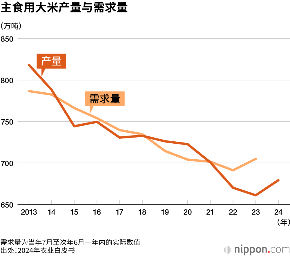 因北日本和东日本地区从饲料用大米改种主食用大米,水稻种植面积增加,以及全国大部分地区天气状况良好等原因,2024年产主食用大米产量同比增加2.8%至679.2万吨。2022和2023年连续两年产量未能满足需求量,成为导致近段时期“米价飞涨”的一大重要原因。