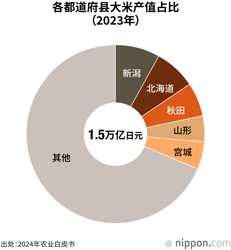 从各都道府县2023年的大米产值来看,新潟县位居榜首,占比为8.2%。其次是北海道(7.5%)、秋田(6.1%)、山形(4.8%)、宫城(4.8%),其他42个都府县生产了剩余的68.6%。