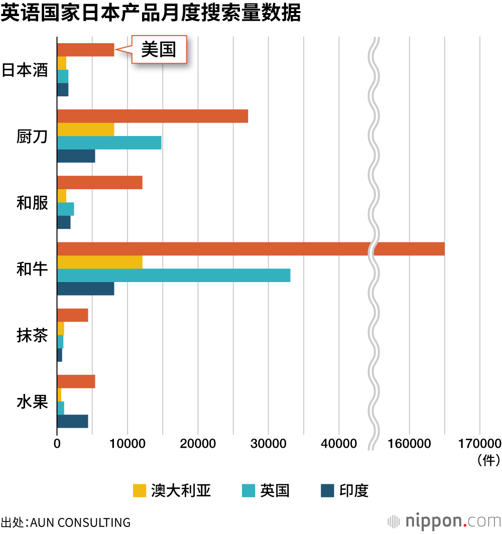 在英语国家中,整体上“和牛/wagyu beef”和“厨刀/Japanese knives”的搜索量较大。美国的搜索量多于其他国家,反映出与日本的经济联系之密切以及人口规模,其中又以“和牛”的搜索量最为突出,可见其关注度之高。