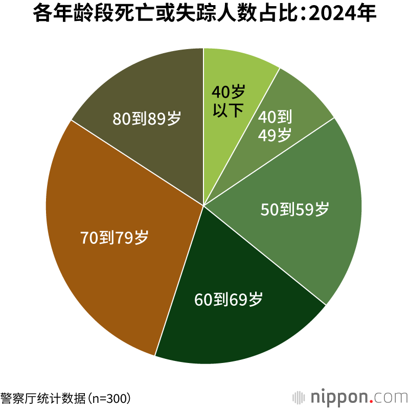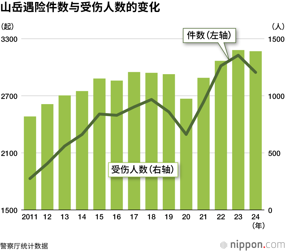 相较2023年,2024年日本的山岳遇险事件数减少180起(5.8%),遇险人数减少211人(5.9%),300人(同比减少35人)死亡或失踪,1390人(同比减少10人)受伤。遇险者中大约半数得到了营救,大约40%被营救时处于受伤状态,近10%死亡或失踪。
