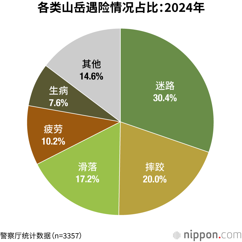 日本警察厅公布的2024年山岳遇险概况显示,遇险事件共发生2946起,涉及人数3357人。虽然较历史峰值的上一年有所减少,但依然处于高位。