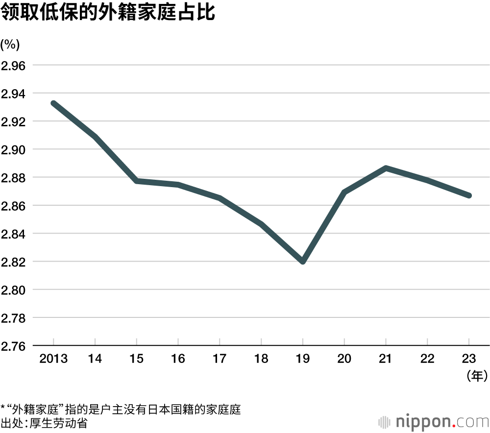 日本总务省的调查统计显示,2023年度在享受日本最低生活保障制度,领取生活保护费的家庭中,外籍家庭占比为2.9%。