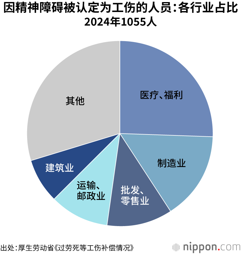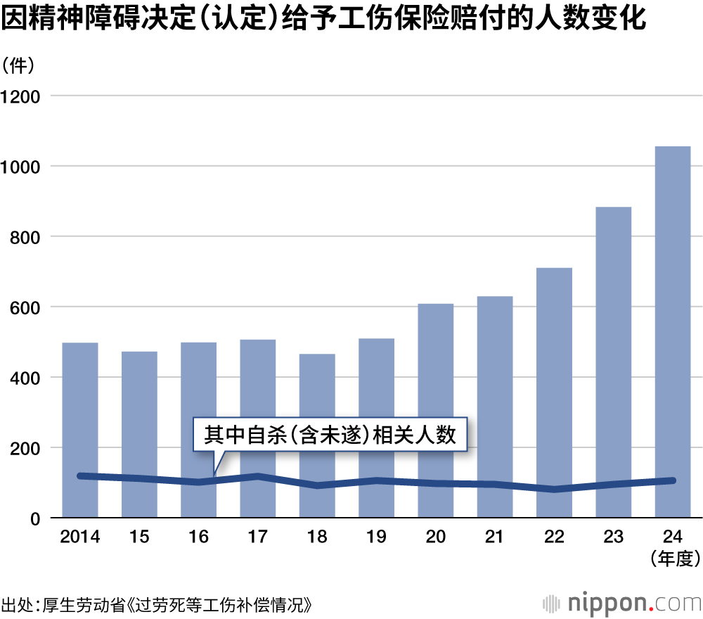 “过劳死等情况”中,因脑中风或心脏病而被认定为工伤的人数为247人,因抑郁等精神障碍而被认定为工伤的人数为1057人。其中,自杀或自杀未遂事件达89件。