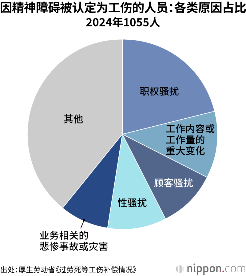 从被认定为工伤的1055起精神障碍相关案例的具体情况来看,在各类原因中,选择受到“上司等的职权骚扰”的人最多,共有224人;其次是“工作内容或工作量的重大变化”,为119人;受到顾客或客户严重骚扰行为的“顾客骚扰”者和受到“性骚扰”者分别为108人和105人。另外,有87人为“经历或目睹了业务相关的悲惨事故或灾害”。