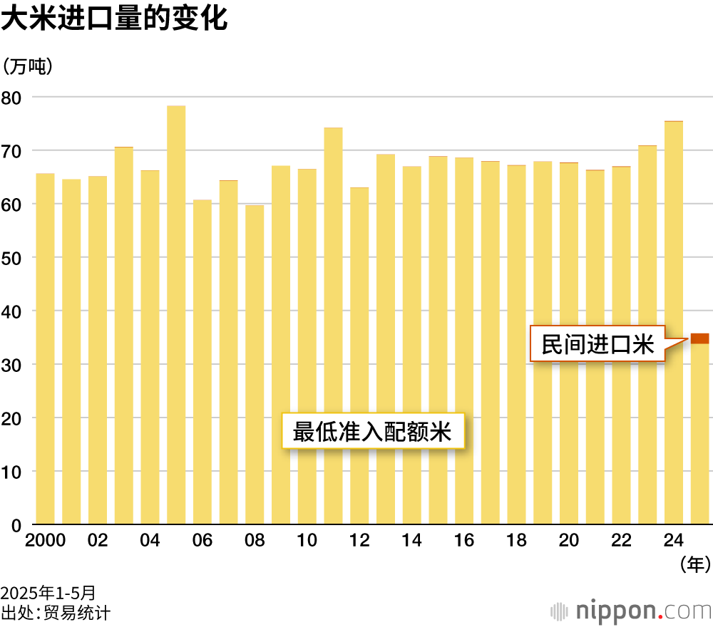 把民间进口部分单独制图可以发现,进入2025年以来出现了激增。3月单月1280吨,超过了2024年全年(1015吨),4月6838吨,5月10650吨,呈现单边上升趋势。个中原因,在于日本国产大米价格飙升,即使加上了关税等进口成本,外国大米依然显得较为便宜。过去从泰国、越南、印度等亚洲国家进口的大米较多,而2025年以来,美国米的进口比例上升,5月超过了70%。