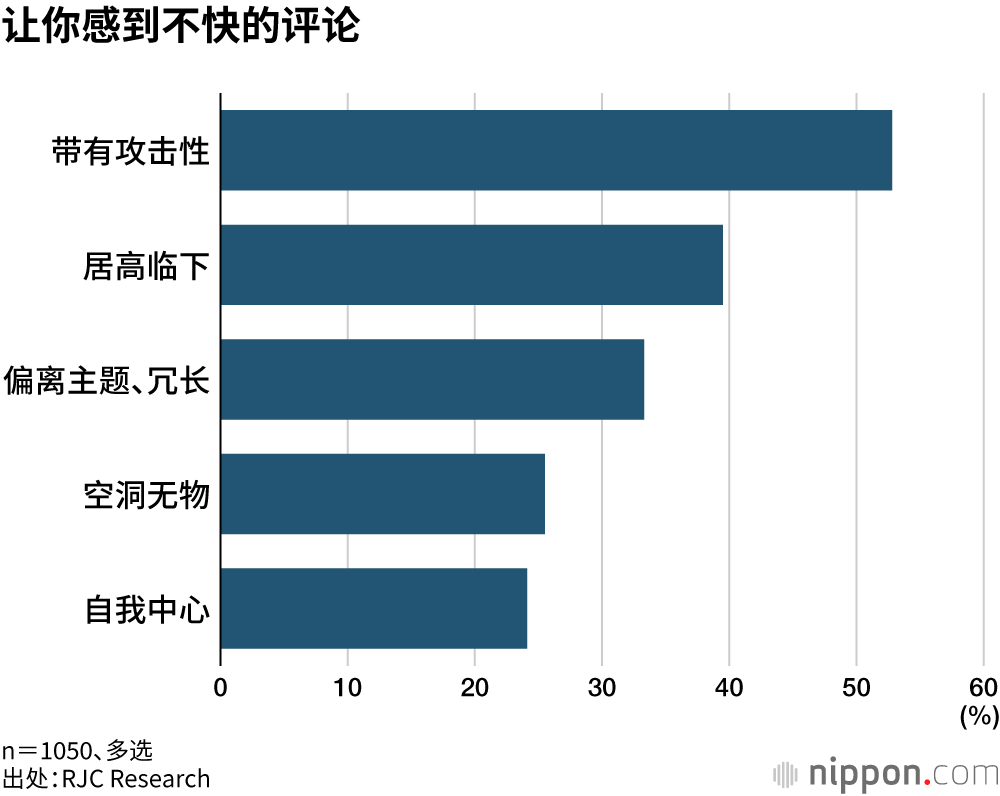 关于令人感到不快的网贴内容(多选),大约五成受访者都列举了包括谣言、虚假新闻、八卦等在内的“传播不确切信息”选项,“使人困惑的行为、网暴”位居第二。关于评论、回帖互动(多选),选择“攻击性评论”的受访者最多,占比达52.8%。