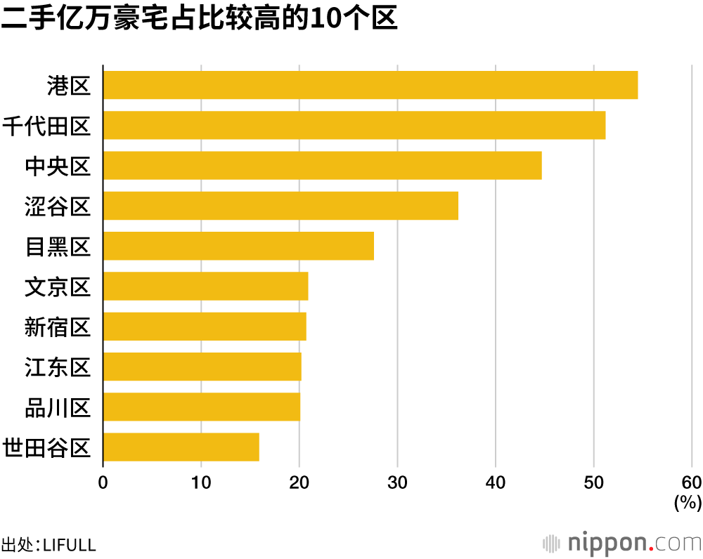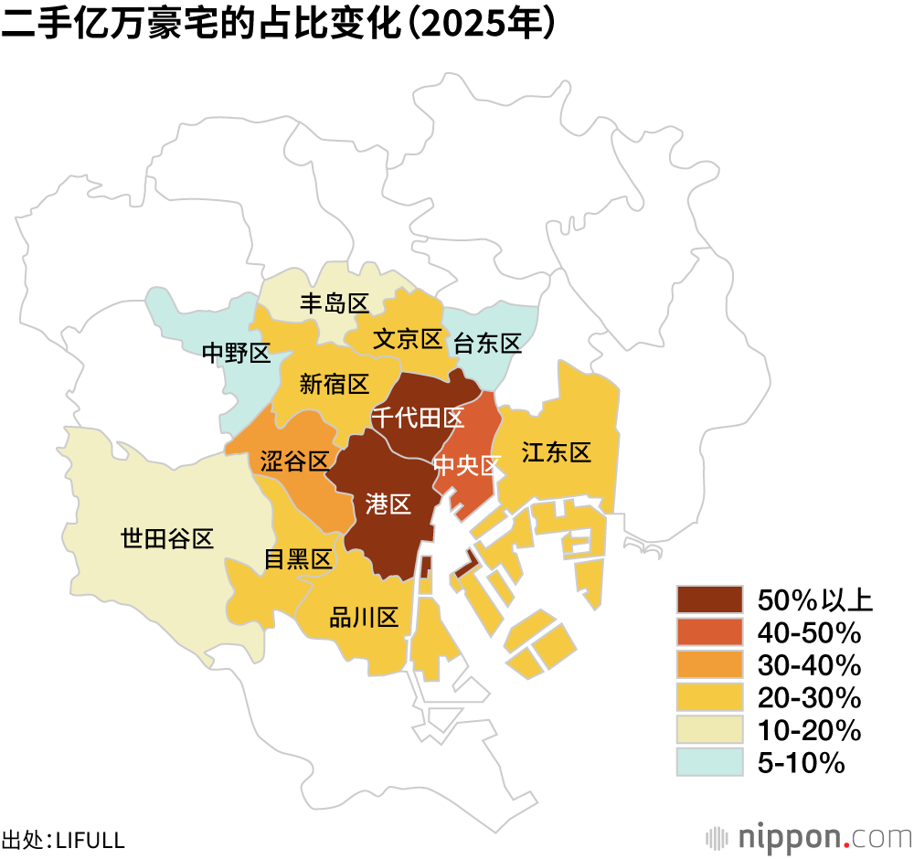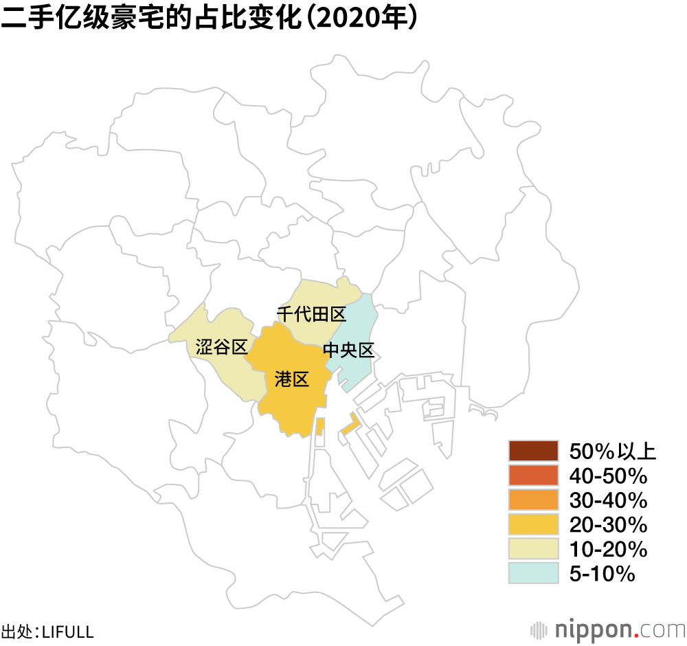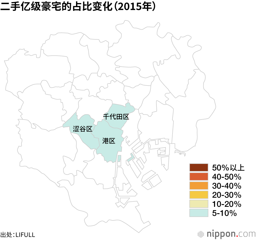 主要集中了城市核心区域功能的千代田、中央、港、新宿、涩谷和文京六区的二手亿级豪宅占比持续上升。而23区中有10个区的二手豪宅占比不到5%。