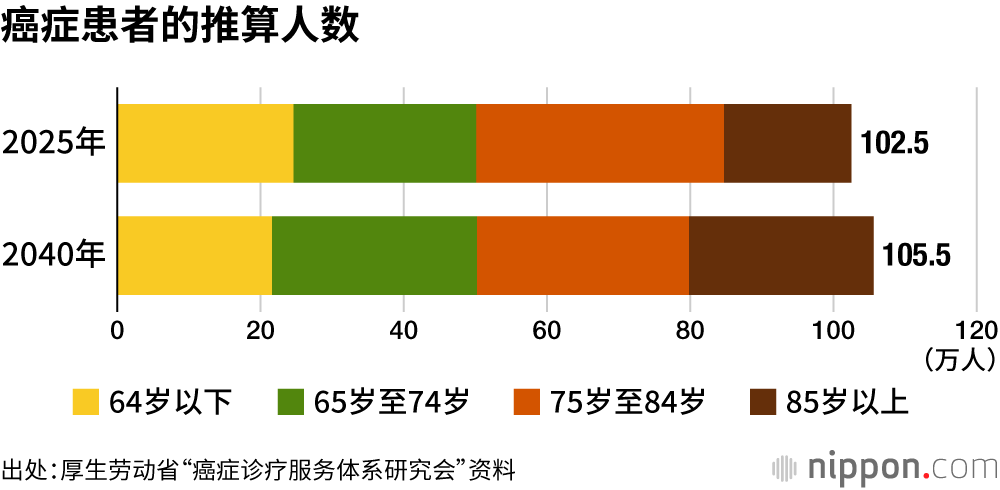 日本厚生劳动省的“癌症诊疗服务体系研究会”依据各种数据推算出了2040年的癌症治疗需求和医疗方的服务体系。目前日本全国共有102.5万名癌症患者(新确诊患者),2040年将增加3%至105.5万人,在老龄化问题加剧导致人口进一步减少的背景下,预计之后将缓慢转为减少。