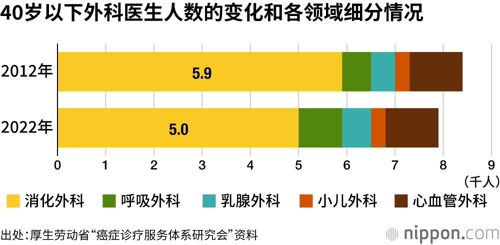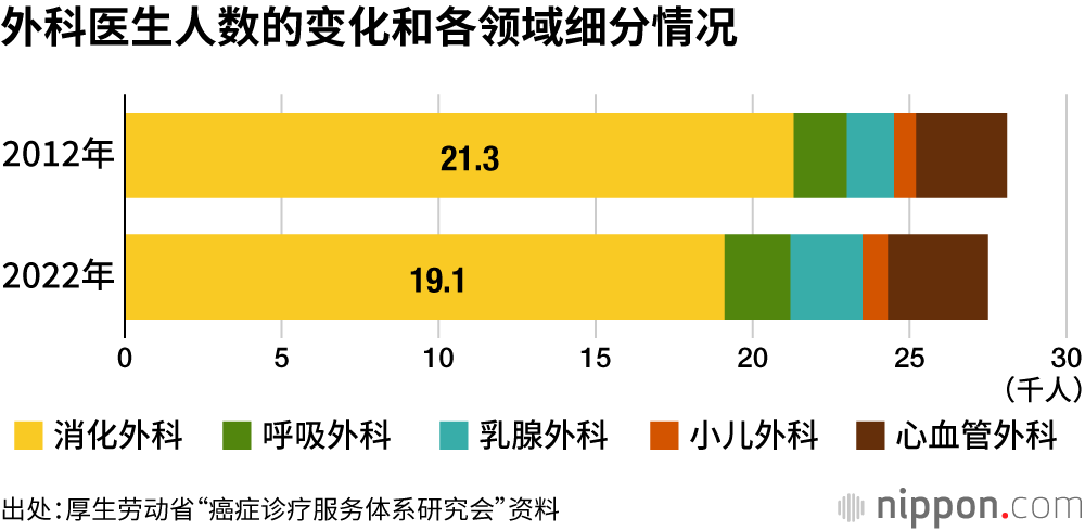 据预测,虽然手术需求减少,但医生人数将以更快的速度减少。尤其是消化外科医生,2022年已减少至大约1.9万人,十年间减少了10%。40岁以下的年轻医生减少率更高,达到了15%。资料指出,背景原因在于年轻人倾向于回避长时间手术和休息日夜间急诊等艰苦的工作条件。