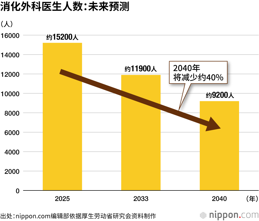 该研究会认为,如果按现状继续发展,到2040年时,日本消化系统外科学会的所属医生(65岁以下)将从2025年的15200人减少约39%至9200人。考虑到今后的手术需求,预计将出现5200人的缺口。