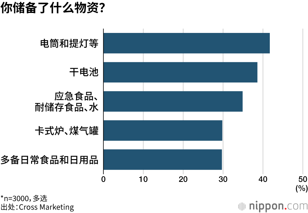 关于“物资储备”(多选),选择“电筒和提灯等照明用具”的受访者最多,占比为41.7%。其次是“干电池”(38.6%)、“应急食品、耐储存食品、瓶装水”(34.9%)等。选择“没有水也可以使用的简易马桶”的受访者占比为20.1%,较去年的调查上升5.4个百分点。