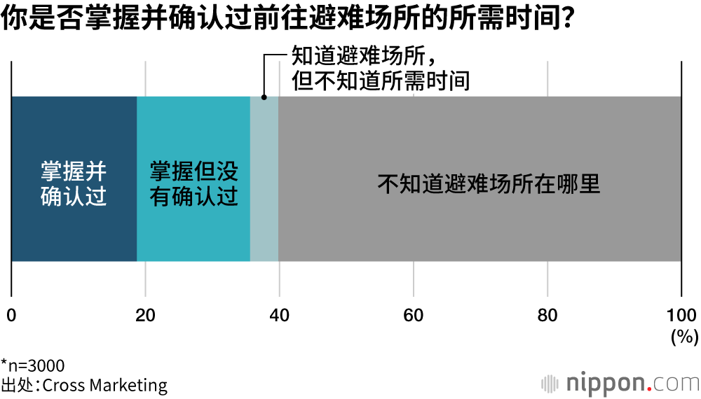 关于针对离家最近的避难场所和前往所需时间的掌握情况,60.2%的受访者表示“不清楚避难场所在哪里”。18.7%表示“掌握前往避难场所所需的时间,并且实际确认过”。