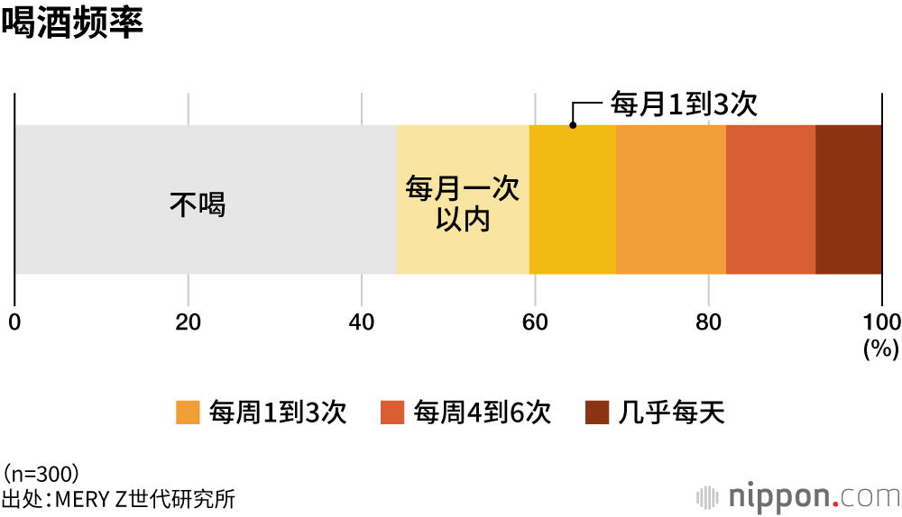 Z世代市场调查企业MERY(东京都千代田区)7月针对300名20到29岁民众实施的《饮酒相关问卷调查》显示,关于喝酒频率,表示“不喝酒”的受访者比例高达44.0%,遥遥领先于其他选项。若将“每月一次以内”的人也纳入其中,那么“基本不饮酒派”的合计比例达到了59.3%。