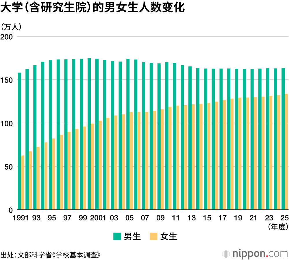 大学本科学生人数为264.6万人(同比增加1.8万人),女生122万人(同比增加1.5万人),均创历史新高;女生在本科生中的占比为46.1%(同比上升0.2个百分点),创历史新高。