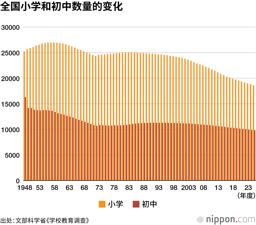 日本全国的小学数量同比减少215所至18607所,初中同比减少55所至9827所,相当于一年间合计共有270所小学和初中消失。