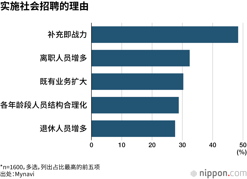 关于企业实施社会招聘的理由(多选),除了“补充即战力”外,受访者还列举了“离职人员增多”(32.4%)、“既有业务扩大”(30.3%)等理由。