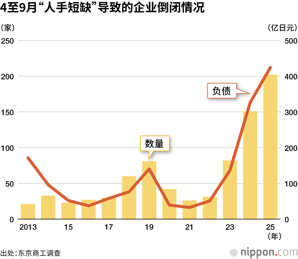 因“人手短缺”倒闭的企业数量达到创新高的202家,同比增加33.8%。其中,66家因“招聘困难”,64家因“员工离职”,72家因“人工费大涨”而倒闭。在人才流动化等问题不断加剧的背景下,小型企业的经营正变得越来越艰难。